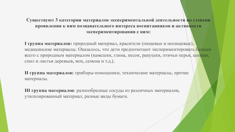 Существуют 3 категории материалов экспериментальной деятельности по степени проявления к ним