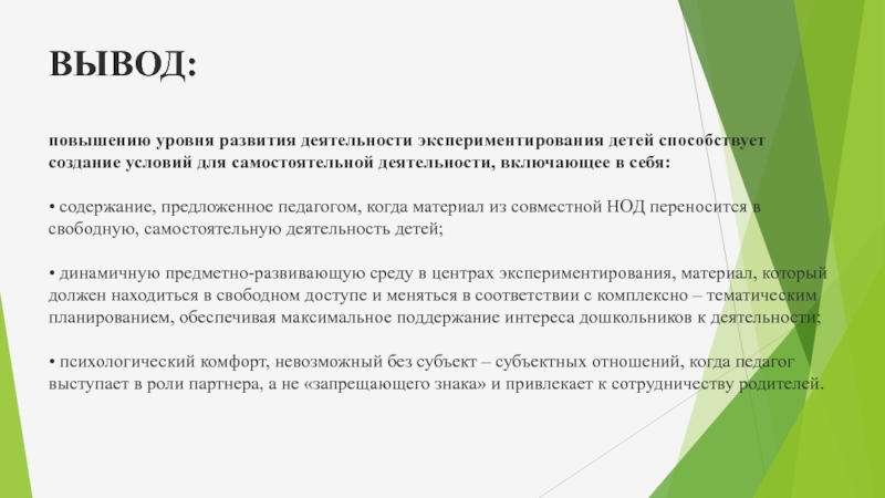 повышению уровня развития деятельности экспериментирования детей способствует создание условий для