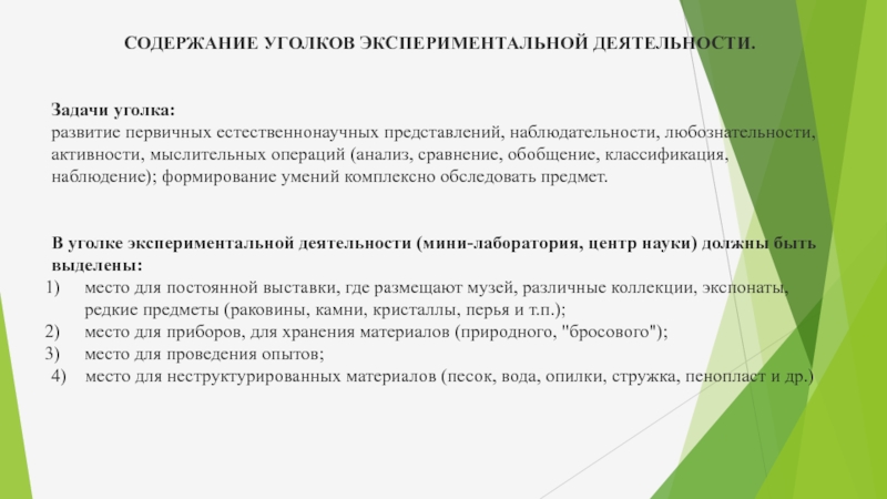 Слайд 19СОДЕРЖАНИЕ УГОЛКОВ ЭКСПЕРИМЕНТАЛЬНОЙ ДЕЯТЕЛЬНОСТИ.