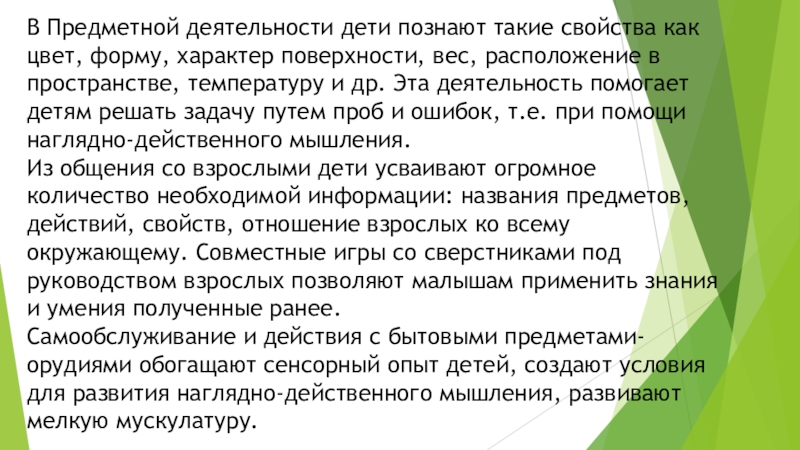 Слайд 8В Предметной деятельности дети познают такие свойства как цвет, форму, характер