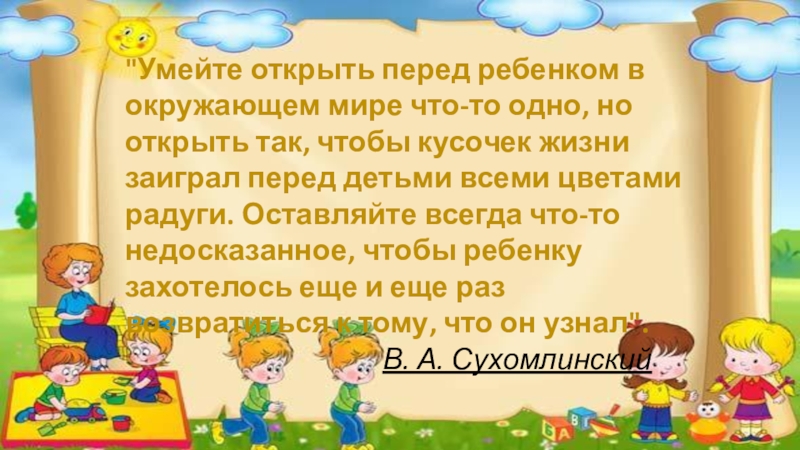 Слайд 2"Умейте открыть перед ребенком в окружающем мире что-то одно, но открыть