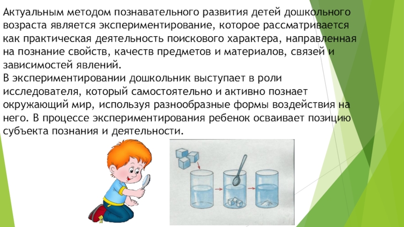 В экспериментировании дошкольник выступает в роли исследователя, который самостоятельно и активно познает окружающий мир, используя разнообразные формы воздействия на него. В процессе экспериментирования ребенок осваивает позицию субъекта познания и деятельности.