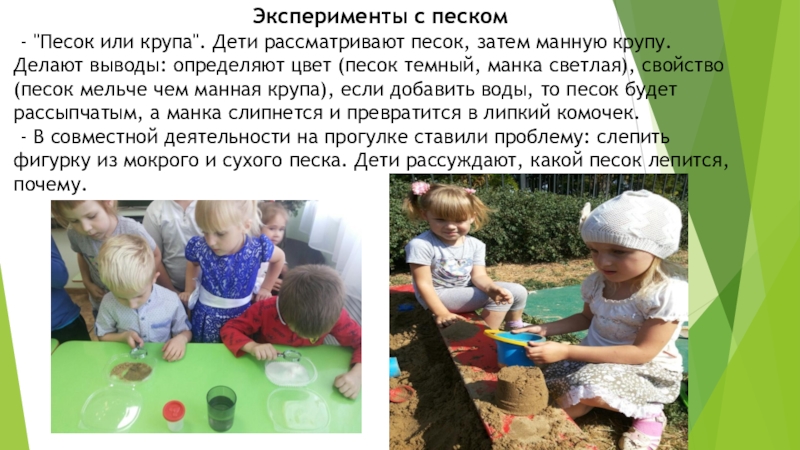 манную крупу. Делают выводы: определяют цвет (песок темный, манка светлая), свойство (песок мельче чем манная крупа), если добавить воды, то песок будет рассыпчатым, а манка слипнется и превратится в липкий комочек.