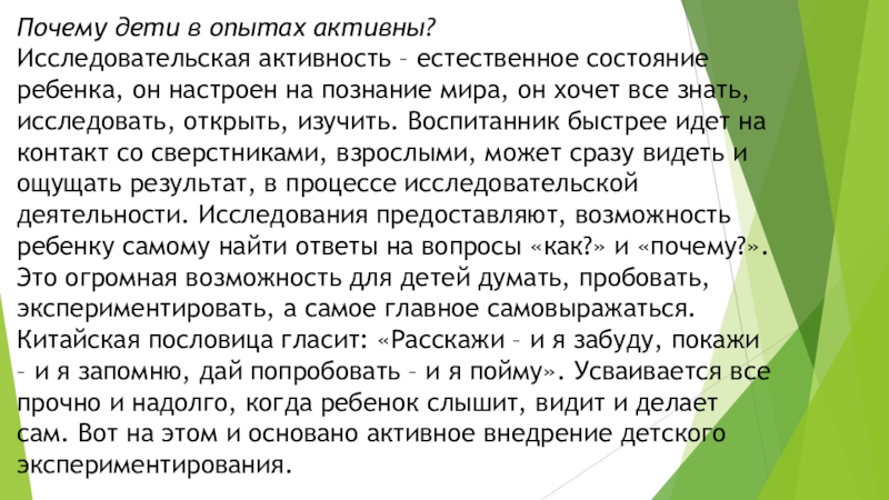 Китайская пословица гласит: «Расскажи – и я забуду, покажи – и я запомню, дай попробовать – и я пойму». Усваивается все прочно и надолго, когда ребенок слышит, видит и делает сам. Вот на этом и основано активное внедрение детского экспериментирования.