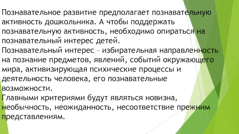 Слайд 5Познавательное развитие предполагает познавательную активность дошкольника. А чтобы поддержать познавательную активность,
