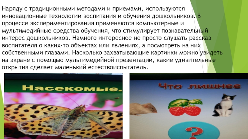 обучения дошкольников. В процессе экспериментирования применяются компьютерные и мультимедийные средства обучения, что стимулирует познавательный интерес дошкольников. Намного интереснее не просто слушать рассказ воспитателя о каких-то объектах или явлениях, а посмотреть на них собственными глазами. Насколько захватывающие картинки можно увидеть на экране с помощью мультимедийной презентации, какие удивительные открытия сделает маленький естествоиспытатель.