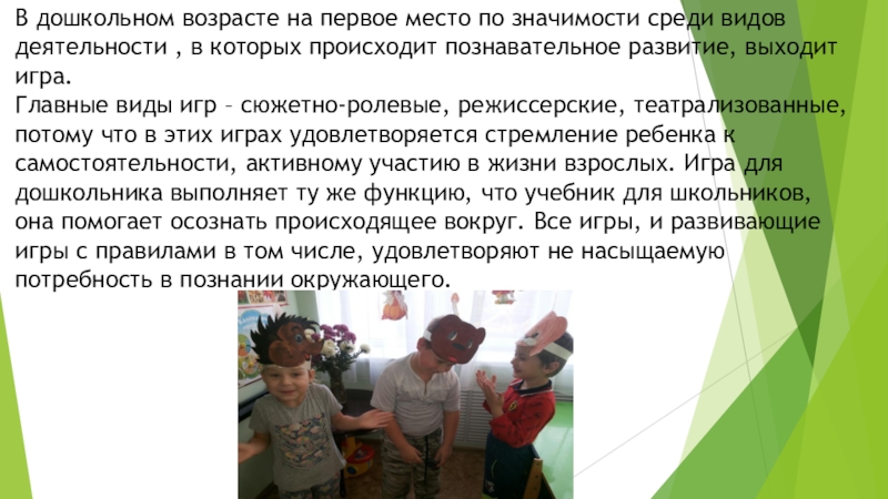 Главные виды игр – сюжетно-ролевые, режиссерские, театрализованные, потому что в этих играх удовлетворяется стремление ребенка к самостоятельности, активному участию в жизни взрослых. Игра для дошкольника выполняет ту же функцию, что учебник для школьников, она помогает осознать происходящее вокруг. Все игры, и развивающие игры с правилами в том числе, удовлетворяют не насыщаемую потребность в познании окружающего.
