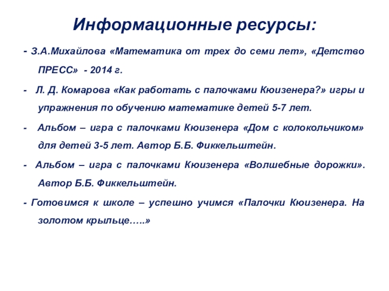 - З.А.Михайлова «Математика от трех до семи лет», «Детство ПРЕСС»