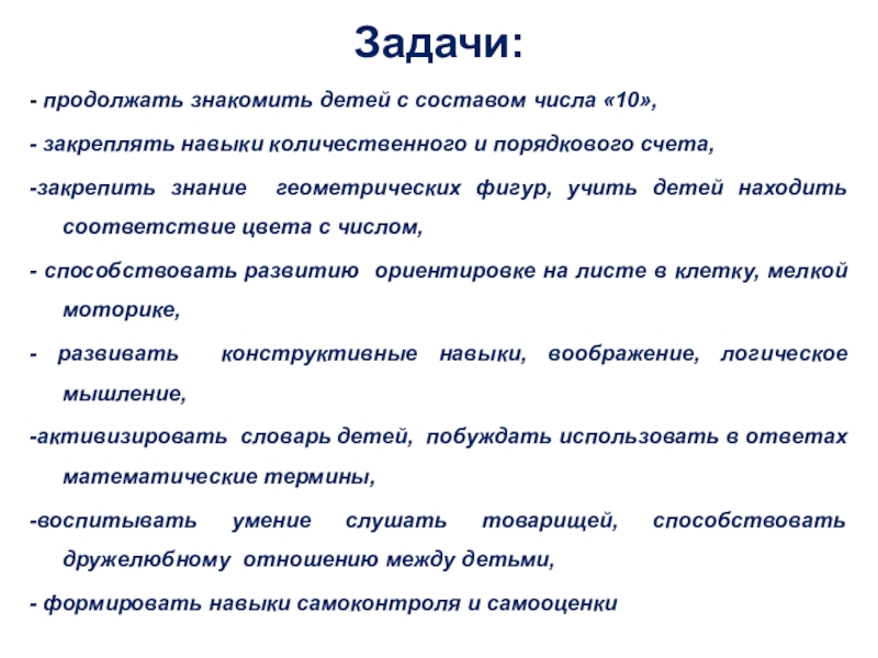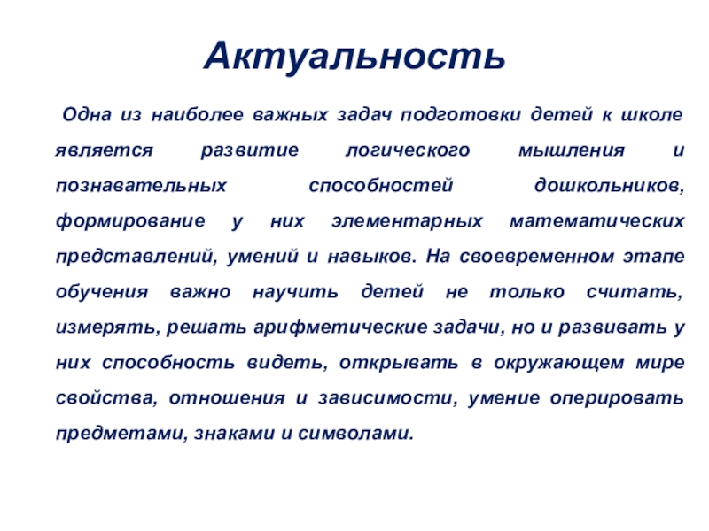 является развитие логического мышления и познавательных способностей дошкольников, формирование у них элементарных математических представлений, умений и навыков. На своевременном этапе обучения важно научить детей не только считать, измерять, решать арифметические задачи, но и развивать у них способность видеть, открывать в окружающем мире свойства, отношения и зависимости, умение оперировать предметами, знаками и символами.