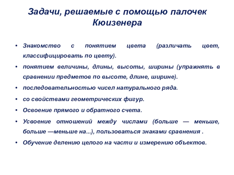 2. Палочки Кюизенера предназначены непосредственно для обучения математике и объяснения математических концепций: развивают мелкую моторику пальцев, пространственное и зрительное восприятие, приучают к порядку.