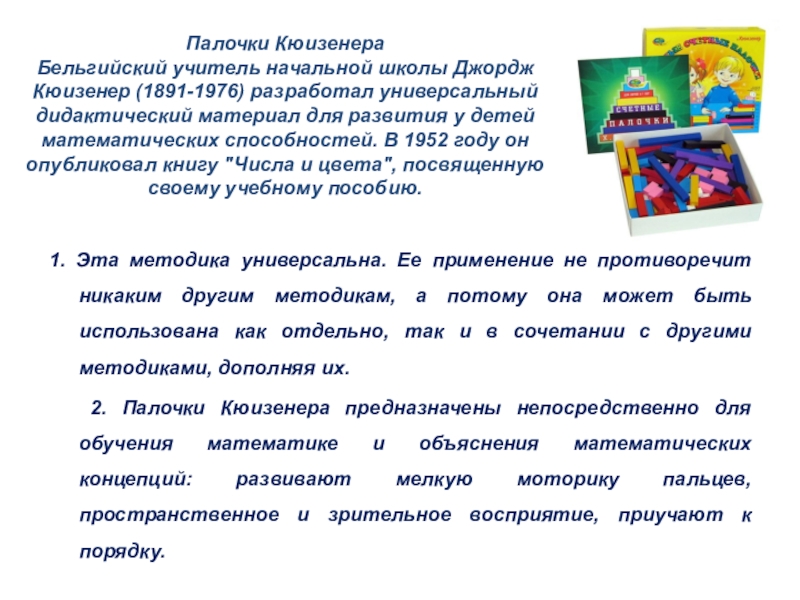 Бельгийский учитель начальной школы Джордж Кюизенер (1891-1976) разработал универсальный дидактический материал для