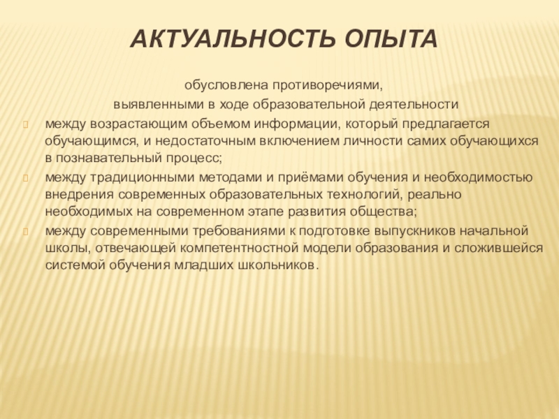 между современными требованиями к подготовке выпускников начальной школы, отвечающей компетентностной модели образования и сложившейся системой обучения младших школьников.