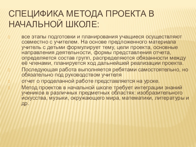 Метод проектов в начальной школе требует интеграции знаний учеников в различных предметных областях: изобразительного искусства, музыки, окружающего мира, математики, литературы и др.
