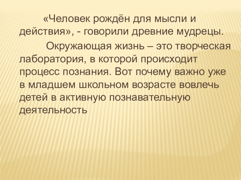 Окружающая жизнь – это творческая лаборатория, в которой происходит процесс познания. Вот почему важно уже в младшем школьном возрасте вовлечь детей в активную познавательную деятельность