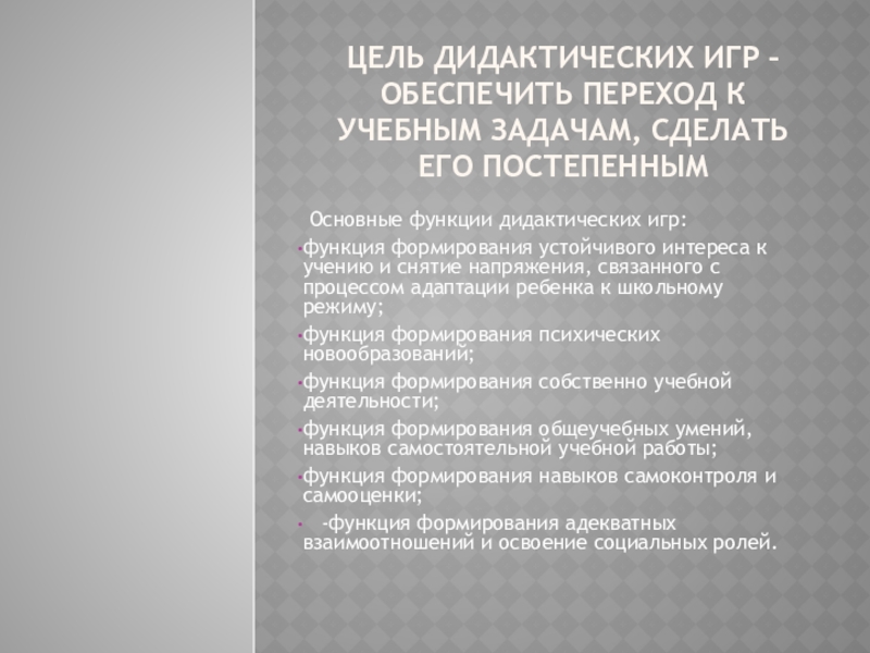функция формирования устойчивого интереса к учению и снятие напряжения, связанного с процессом адаптации ребенка к школьному режиму;