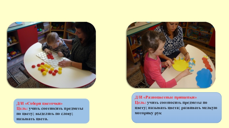 Цель: учить соотносить предметы по цвету; называть цвета; развивать мелкую моторику рук