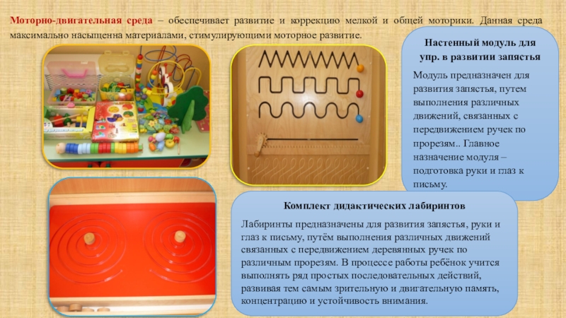Модуль предназначен для развития запястья, путем выполнения различных движений, связанных с передвижением ручек по прорезям.. Главное назначение модуля – подготовка руки и глаз к письму.