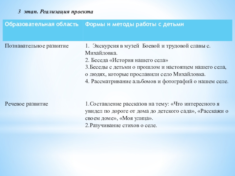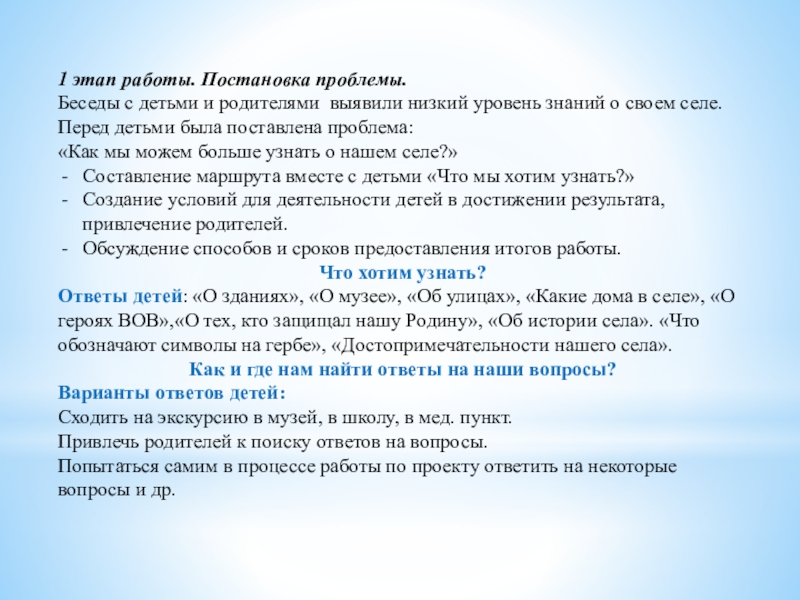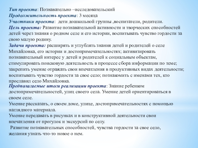 Предполагаемые итоги реализации проекта: Знание ребенком достопримечательностей, улиц своего села. Умение детей ориентироваться в своем селе.