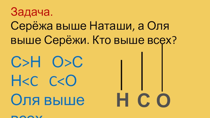 Задача.Серёжа выше Наташи, а Оля выше Серёжи. Кто выше всех?С>Н  О>СН