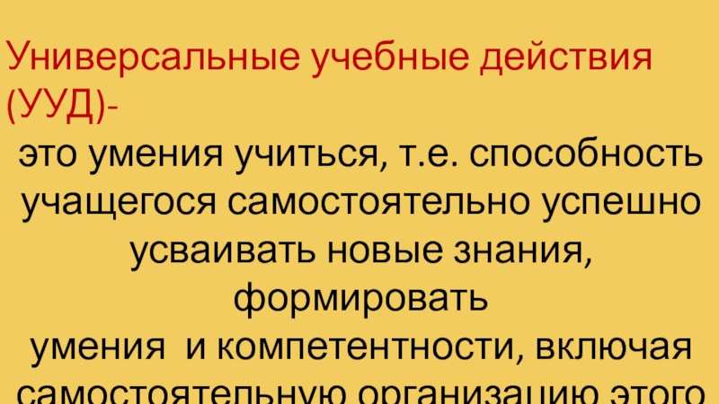 Универсальные учебные действия(УУД)- это умения учиться, т.е. способность учащегося самостоятельно успешноусваивать новые знания, формироватьумения и компетентности, включаясамостоятельную организацию этогопроцесса.