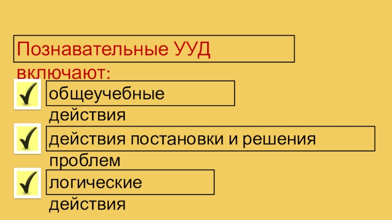 Познавательные УУД включают: общеучебные действиядействия постановки и решения проблемлогические действия