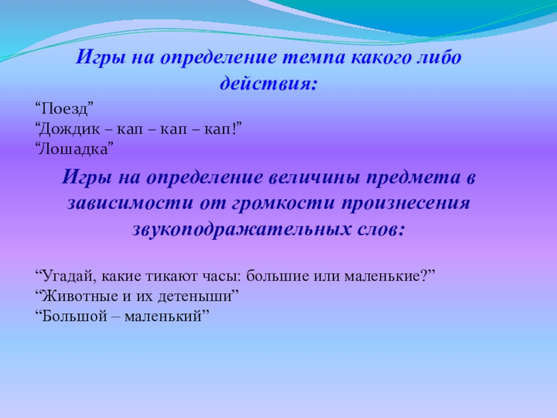 - «Попугаи» (сымитировать звуки окружающего мира – тихо, громко, медленно, быстро…)