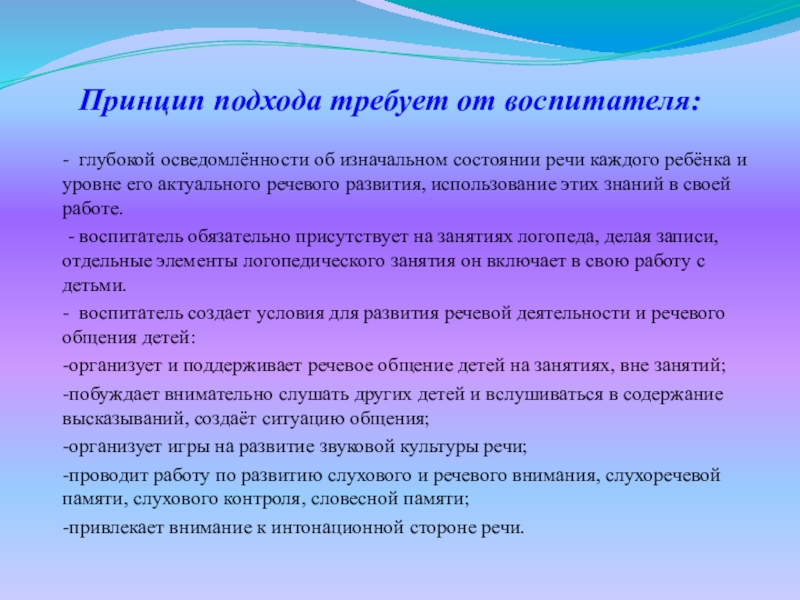 - принцип индивидуального подхода предполагает учёт индивидуально-речевых особенностей детей.