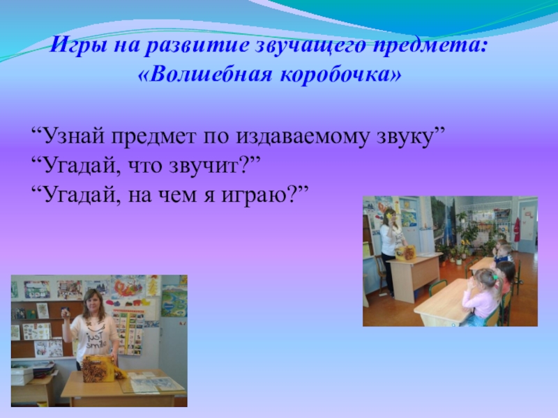 Потом проводим игру «Что звучит?»: предлагаем «Волшебную коробочку» где дети угадываю звук инструмента, издаваемый из короба.