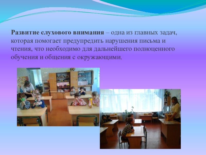 Слайд 3Развитие слухового внимания – одна из главных задач, которая помогает предупредить