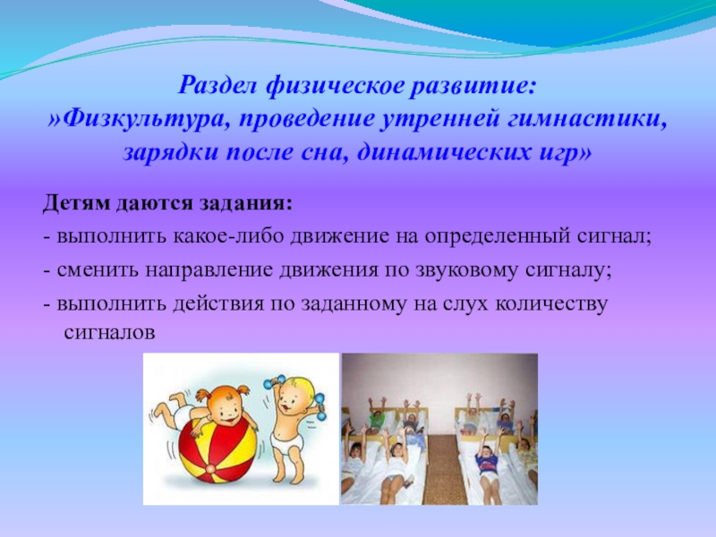 »Физкультура, проведение утренней гимнастики, зарядки после сна, динамических игр»