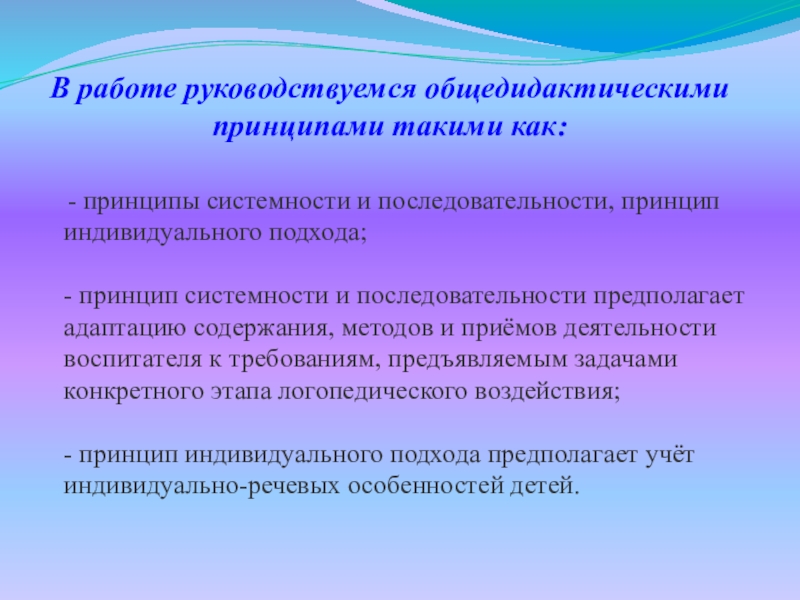 - принцип системности и последовательности предполагает адаптацию содержания, методов и приёмов деятельности воспитателя к требованиям, предъявляемым задачами конкретного этапа логопедического воздействия;