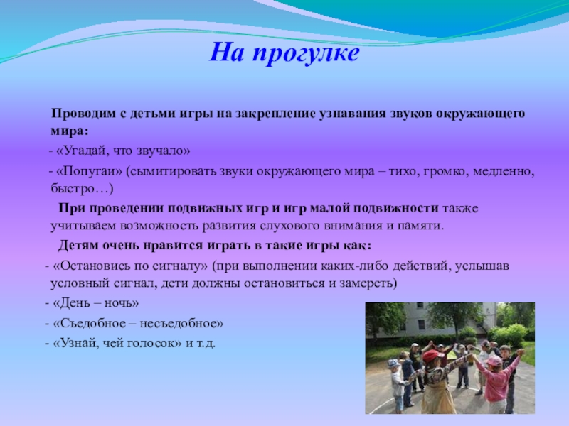 При проведении подвижных игр и игр малой подвижности также учитываем возможность развития слухового внимания и памяти.