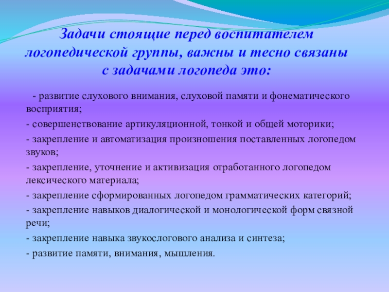 Слайд 6Задачи стоящие перед воспитателем логопедической группы, важны и тесно связаны с