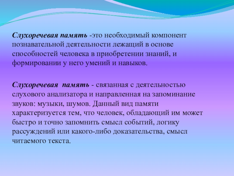 Слайд 2Слухоречевая память -это необходимый компонент познавательной деятельности лежащий в основе способностей