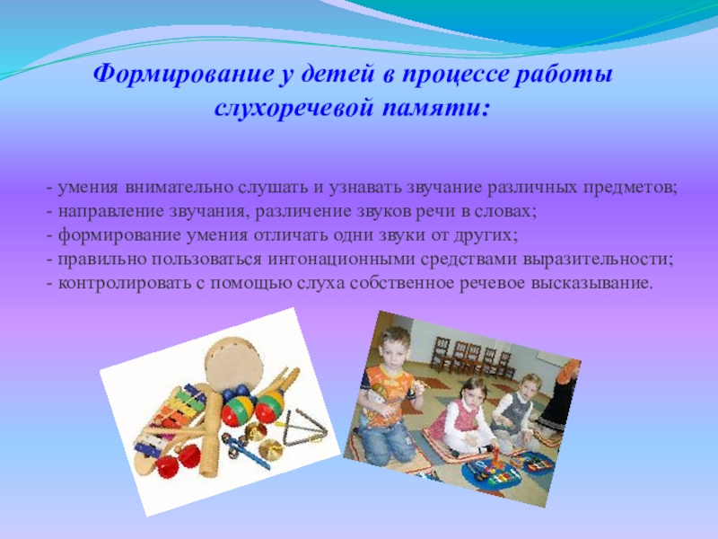 Слайд 5Формирование у детей в процессе работы слухоречевой памяти:
