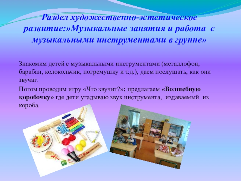 Слайд 11Раздел художественно-эстетическое развитие:»Музыкальные занятия и работа с музыкальными инструментами в группе»