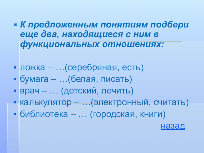 Слайд 9К предложенным понятиям подбери еще два, находящиеся с ним в функциональных