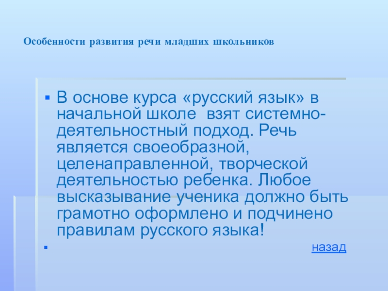 школе взят системно-деятельностный подход. Речь является своеобразной, целенаправленной, творческой деятельностью ребенка. Любое высказывание ученика должно быть грамотно оформлено и подчинено правилам русского языка!