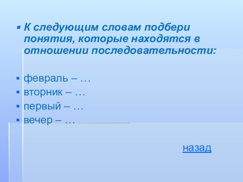 Слайд 8К следующим словам подбери понятия, которые находятся в отношении последовательности: