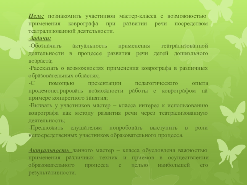 Цель: познакомить участников мастер-класса с возможностью применения коврографа при развитии речи посредством театрализованной деятельности. Задачи:-Обозначить актуальность применения