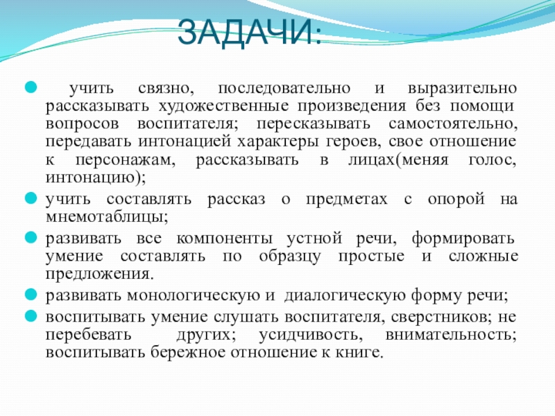 учить связно, последовательно и выразительно рассказывать художественные произведения без помощи