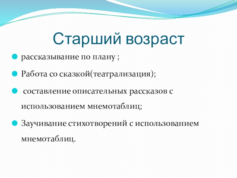 Старший возрастрассказывание по плану ;Работа со сказкой(театрализация); составление описательных рассказов с использованием мнемотаблиц;Заучивание стихотворений с использованием мнемотаблиц.
