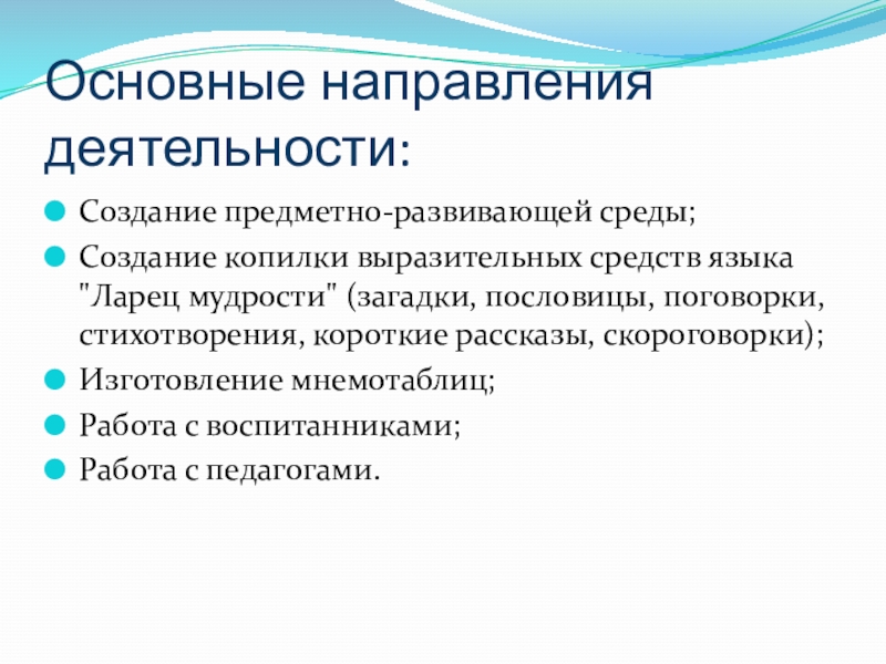 Основные направления деятельности:Создание предметно-развивающей среды;Создание копилки выразительных средств языка