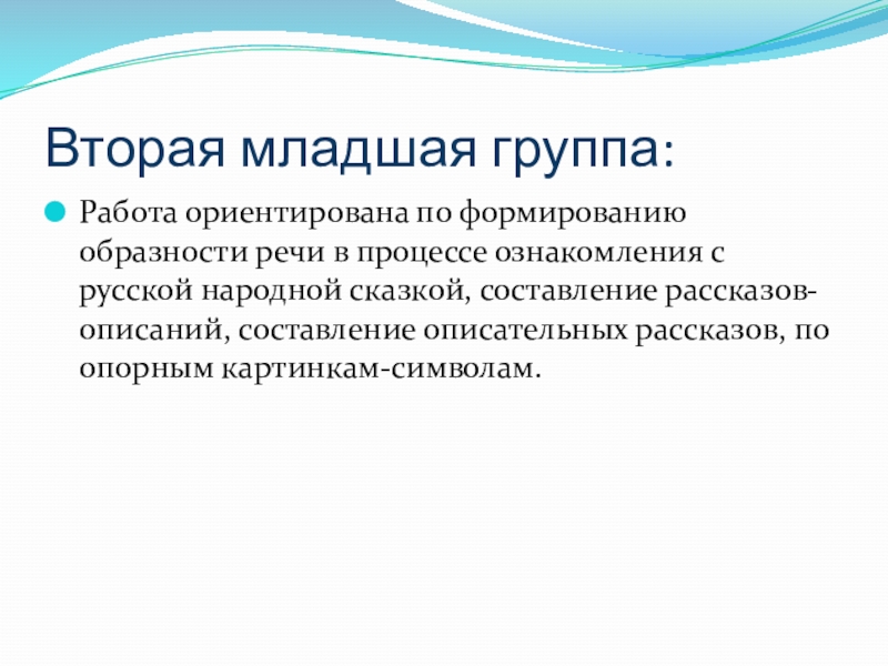 Вторая младшая группа:Работа ориентирована по формированию образности речи в процессе ознакомления с русской народной сказкой, составление рассказов-описаний,
