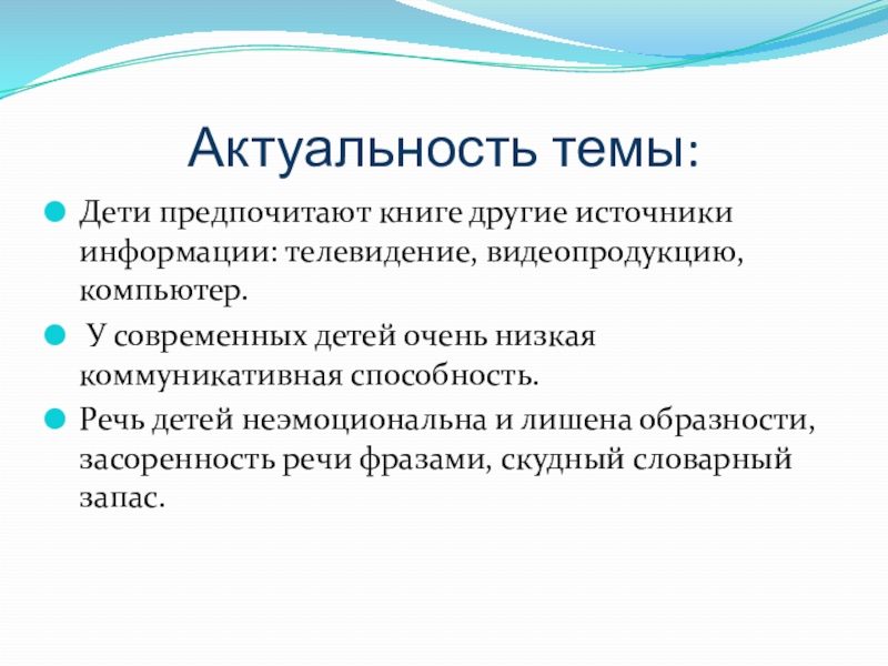 Актуальность темы:Дети предпочитают книге другие источники информации: телевидение, видеопродукцию, компьютер. У современных детей очень низкая коммуникативная способность.