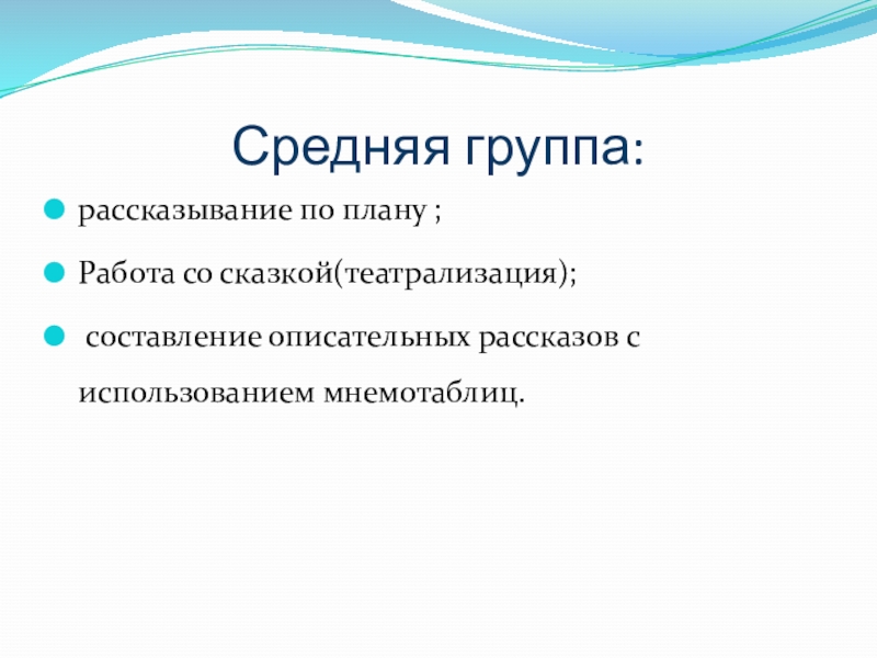 Средняя группа:рассказывание по плану ;Работа со сказкой(театрализация); составление описательных рассказов с использованием мнемотаблиц.