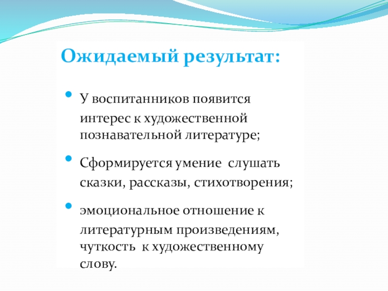 Ожидаемый результат:У воспитанников появится интерес к художественной познавательной литературе;Сформируется умение слушать сказки, рассказы, стихотворения; эмоциональное отношение к