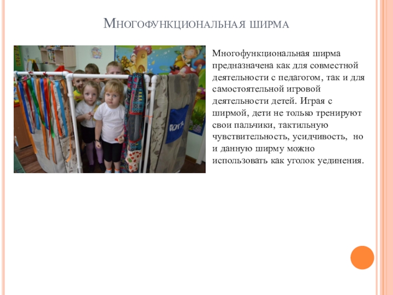 так и для самостоятельной игровой деятельности детей. Играя с ширмой, дети не только тренируют свои пальчики, тактильную чувствительность, усидчивость, но и данную ширму можно использовать как уголок уединения.