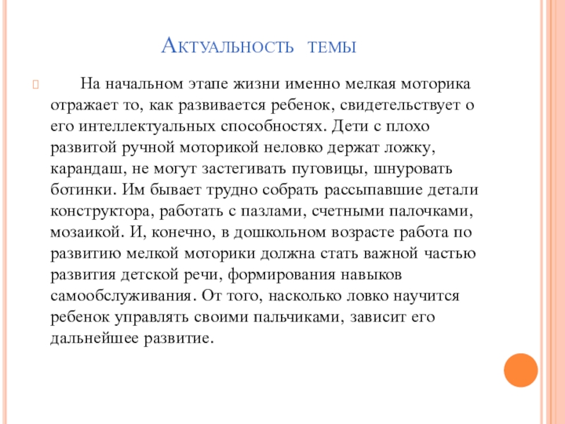 отражает то, как развивается ребенок, свидетельствует о его интеллектуальных способностях. Дети с плохо развитой ручной моторикой неловко держат ложку, карандаш, не могут застегивать пуговицы, шнуровать ботинки. Им бывает трудно собрать рассыпавшие детали конструктора, работать с пазлами, счетными палочками, мозаикой. И, конечно, в дошкольном возрасте работа по развитию мелкой моторики должна стать важной частью развития детской речи, формирования навыков самообслуживания. От того, насколько ловко научится ребенок управлять своими пальчиками, зависит его дальнейшее развитие.