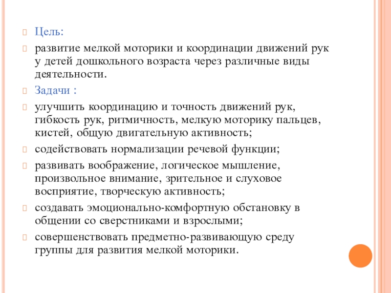 улучшить координацию и точность движений рук, гибкость рук, ритмичность, мелкую моторику пальцев, кистей, общую двигательную активность;